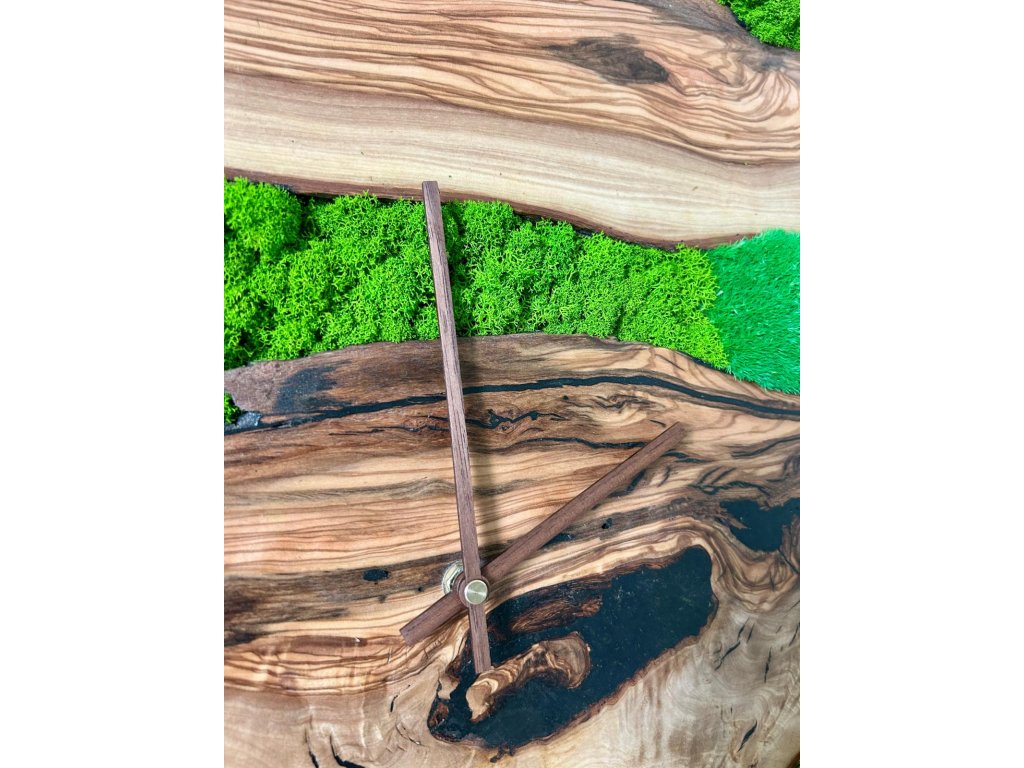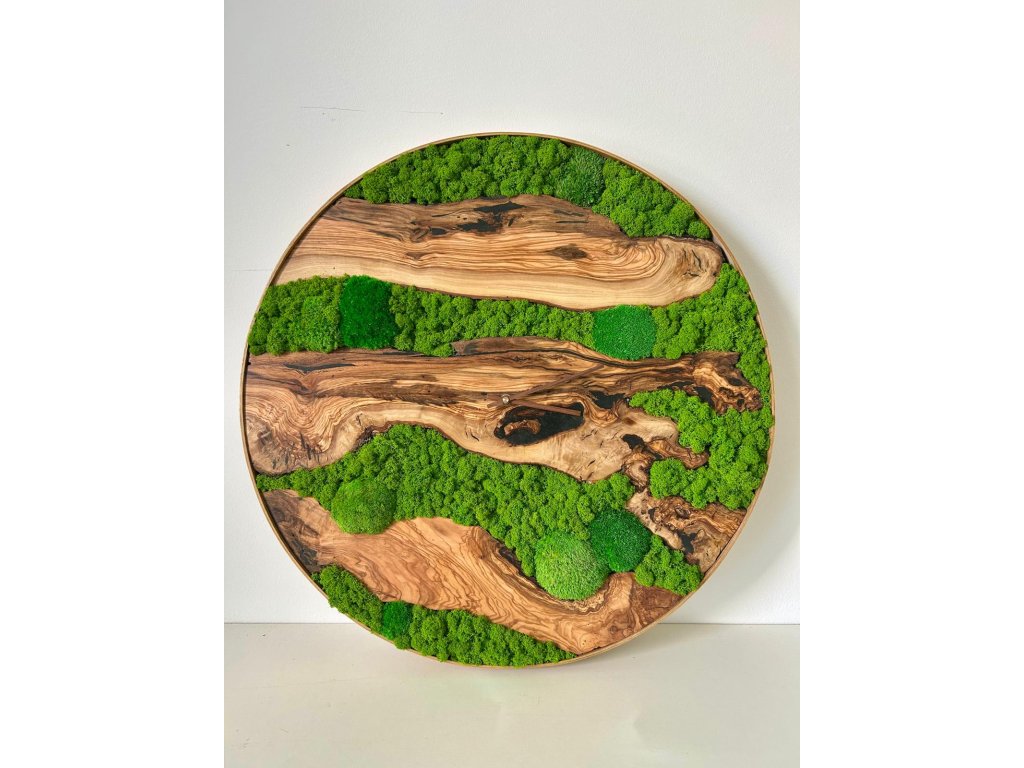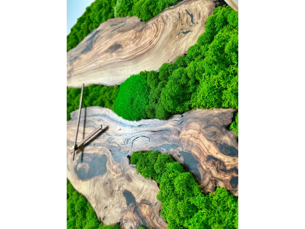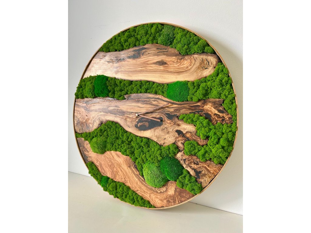 Luxusní kulaté mechové hodiny tvořené primárně překrásným olivovým dřevem, které je doplněno světle zelenými kopečky a převahou finského lišejníku. Velikost hodin záleží zcela na Vás, nepoužíváme žádné prefabrikáty, rámy si vyrábíme sami a proto se meze velikosti nekladou.