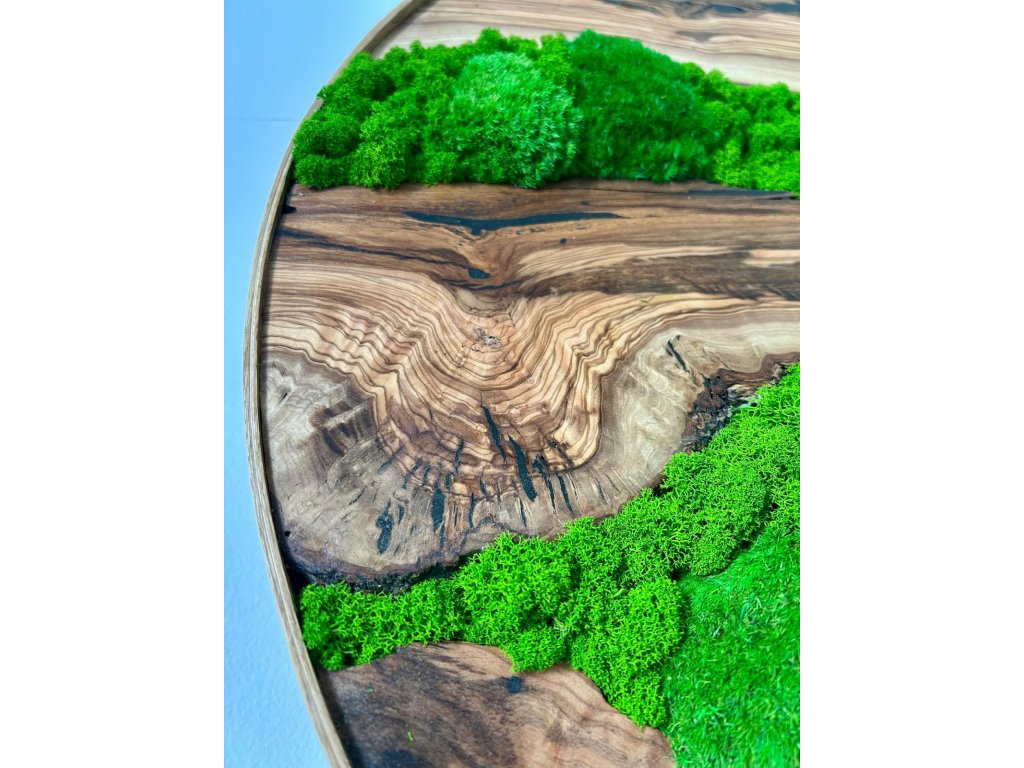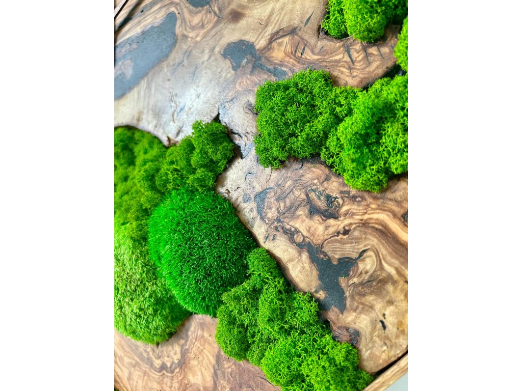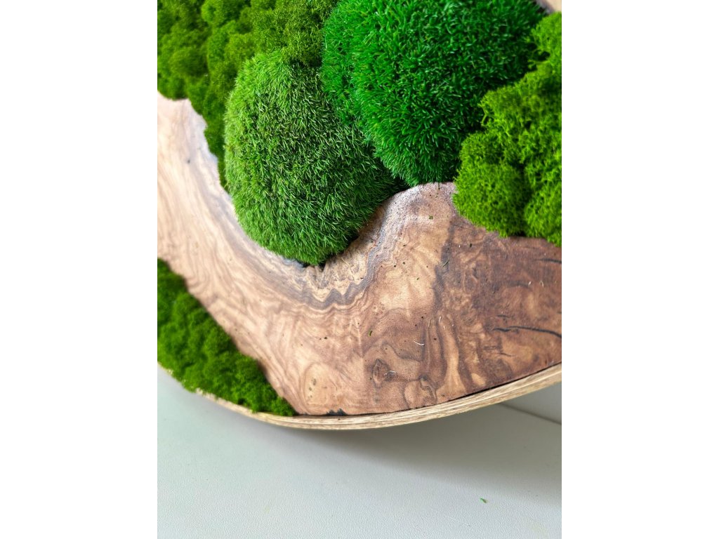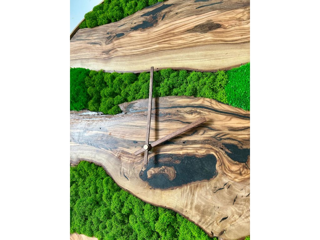 Luxusní kulaté mechové hodiny tvořené primárně překrásným olivovým dřevem, které je doplněno světle zelenými kopečky a převahou finského lišejníku. Velikost hodin záleží zcela na Vás, nepoužíváme žádné prefabrikáty, rámy si vyrábíme sami a proto se meze velikosti nekladou.